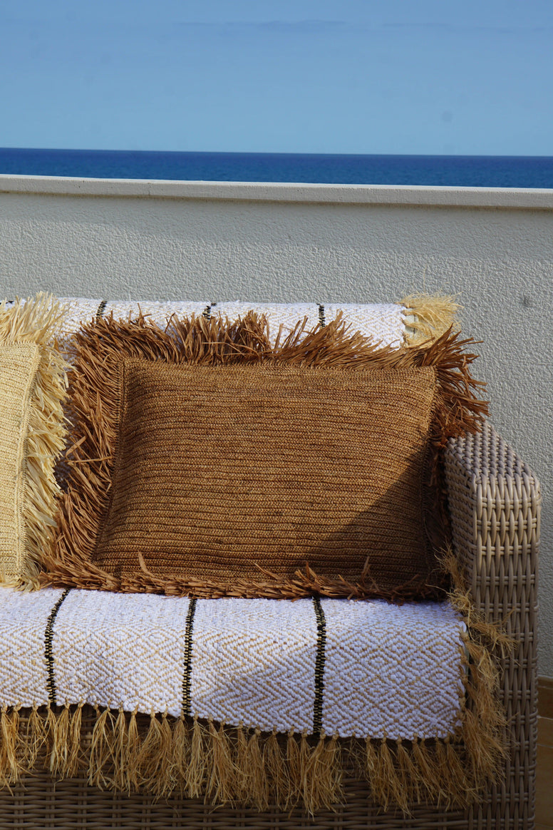 Bring a touch of style and comfort to your space with our natural raffia cushions, designed for both indoor and outdoor use. Handmade with high-quality raffia, these cushions not only offer a stylish aesthetic, but they are also sturdy and weather-resistant. Their timeless design and natural textures blend harmoniously into any decor, whether on your sofa, patio or by the pool.