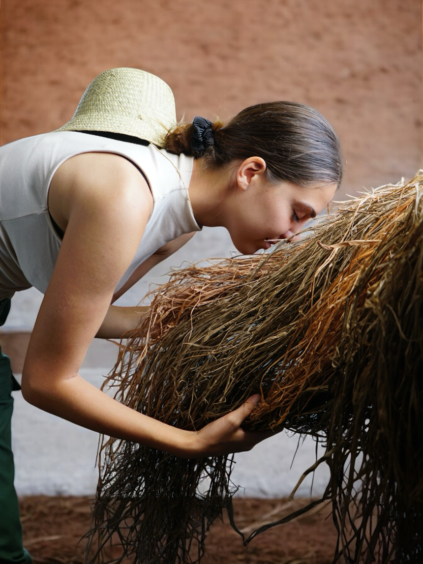 Cada pieza de OQENA se elabora con un material noble, cargado de historia. Las fibras vegetales, como la rafia y otros recursos locales, se seleccionan cuidadosamente, respetando la tierra y las comunidades que la trabajan. Nuestro enfoque es simple: crear sin agotar, transformar sin distorsionar.